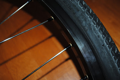 Now run your hand along the other side of the tire pushing the bead onto the rim. Afterwards pump about half of the air pressure allowed for your tire into the tube. Push the tire onto the rim with a small amount of force where it may be bulging. The second picture shows the bead slightly out away from the rim where I applied pressure to seat it correctly. The third photo shows a correctly seated bead with no bulging.